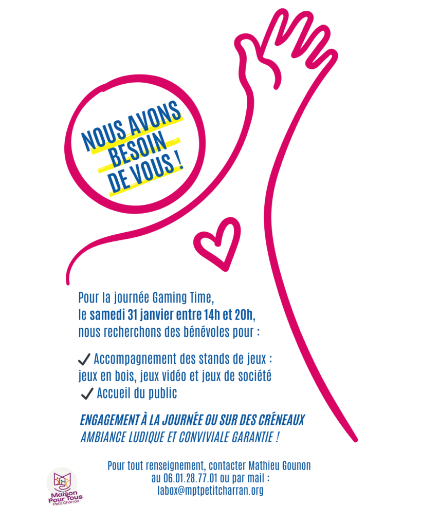 Envie de vous investir dans la vie du quartier ? Nous recherchons des bénévoles pour plusieurs missions : que ce soit pour le Gaming Time, journal de quartier, aide à la scolarité, programmation culturelle et événementielle, votre aide est précieuse ! 👉 Intéressé·e ? Contactez-nous ou venez en parler à la MPT : 📧 contact@mptpetitcharran.org 📞 04 12 04 12 62