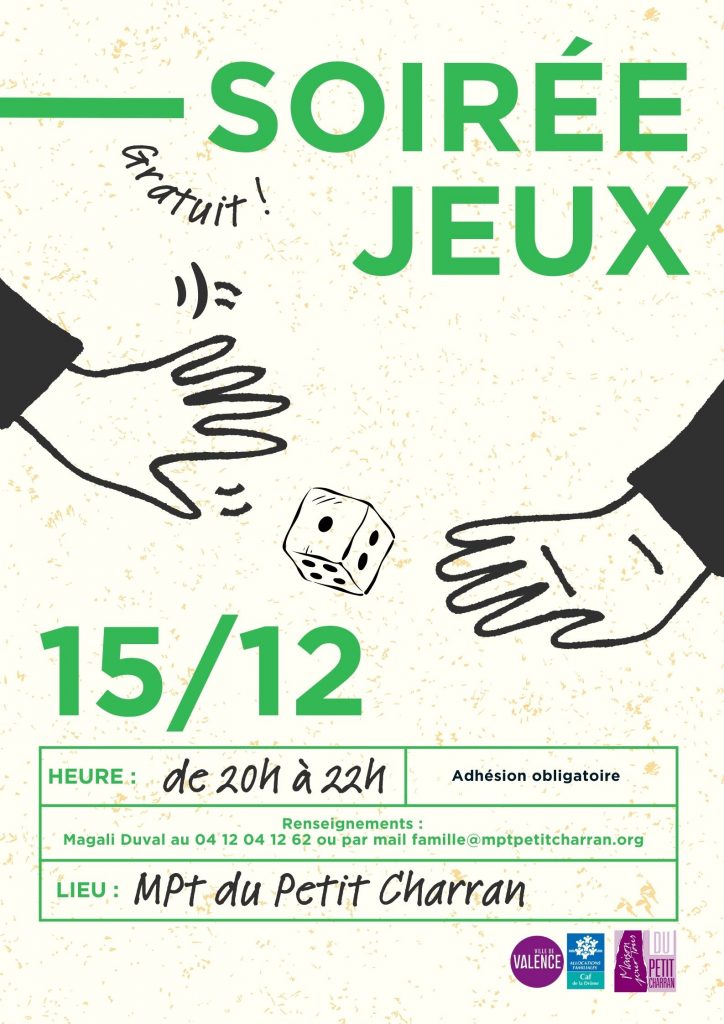 Amateurs de jeux, ne manquez pas notre soirée jeu mensuelle à la MPT Petit Charran le 15 décembre de 20h à 22h ! Venez jouer à vos jeux préférés et passer un moment convivial en famille ou entre amis.