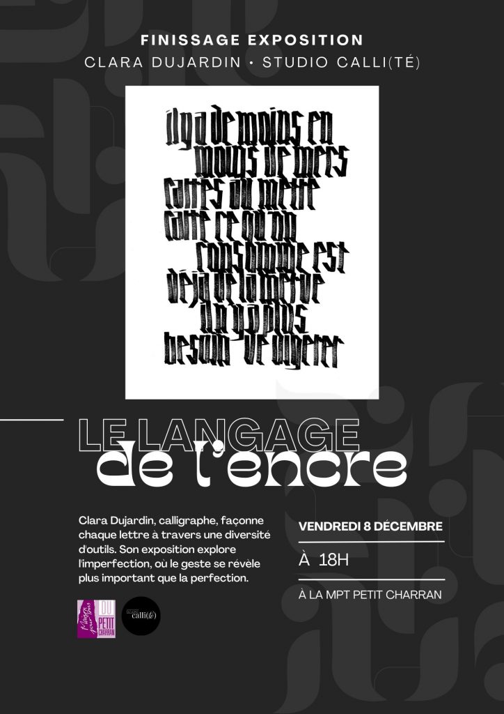 Du 9 novembre au vendredi 8 décembre, nous vous convions à explorer « Le Langage de l’Encre » au sein de l’exposition de calligraphie de l’artiste Clara Dujardin. En remontant aux origines étymologiques de la calligraphie, l’art de bien former les caractères d’écriture se dévoile. Mais que signifie réellement « bien former » ? Clara, au fil de son apprentissage a exploré cette question complexe. Elle maîtrise les règles strictes de la calligraphie latine, offrant une écriture parfaite, mais elle va au-delà. Pour elle, la calligraphie est une expression de nos émotions qui jaillissent au moment de l’écriture, ainsi qu’une libération du geste. Son exposition incarne cette philosophie. Chaque création est imprégnée d’émotions, et chaque lettre est formée avec une prise de liberté. En rentrant dans la salle, vous allez apercevoir de nombreuses calligraphies toutes très différentes, paraissant somptueuses et très bien exécutées. Mais, êtes-vous sûrs qu’elles sont si parfaites que cela ? Approchez-vous et vous découvrirez qu’elles ont toutes un point commun. L’imperfection de l’écriture laissant place à la liberté du geste et de l’encre, où l’émotion l’emporte sur la perfection.