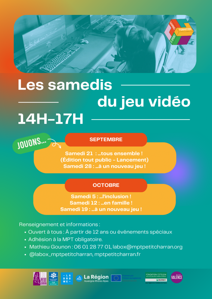 Les Samedis du Jeu Vidéo à la MPT du Petit Charran Envie de partager des moments fun autour des jeux vidéo ? Rejoignez-nous tous les samedis pour des ateliers thématiques, parfaits pour toute la famille ! Que vous soyez joueur novice ou confirmé, il y en aura pour tous les goûts ! Programme : 28/09 : Jouons à un nouveau jeu ! 05/10 : Jouons l’inclusion ! 12/10 : Jouons en famille ! 19/10 : Jouons à un nouveau jeu ! Horaires : Tous les samedis de 14h à 17h Âge minimum : 12 ans (sauf ateliers spécifiés pour les moins de 12 ans) Adhésion à la MPT obligatoire Pour plus d’infos, contactez Mathieu sur Instagram @labox_mptpetitcharran ou par mail à labox@mptpetitcharran. Rejoignez-nous pour des après-midis ludiques et conviviaux !