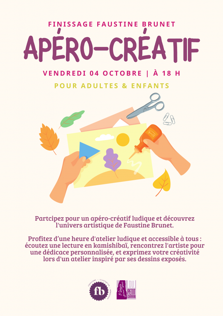 Venez célébrer le finissage de l’exposition de Faustine Brunet et plongez dans son univers artistique unique ! Rejoignez-nous pour une soirée conviviale, où vous pourrez participer à un atelier interactif et ludique, ouvert à tous. Une belle occasion de découvrir ou redécouvrir ses œuvres tout en laissant libre cours à votre créativité. L’atelier dure une heure, alors ne manquez pas ce moment de partage et d’inspiration !