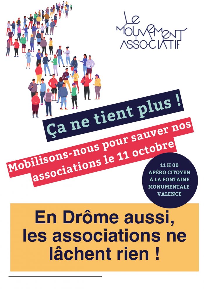 Le Mouvement associatif appelle à une mobilisation nationale le samedi 11 octobre pour alerter sur la crise sans précédent que traverse le secteur associatif français. À Valence, un rassemblement est organisé à 11h devant la Fontaine Monumentale. La Maison Pour Tous du Petit Charran, comme de nombreuses structures associatives, soutient cet appel et encourage ses adhérents et partenaires à y participer.