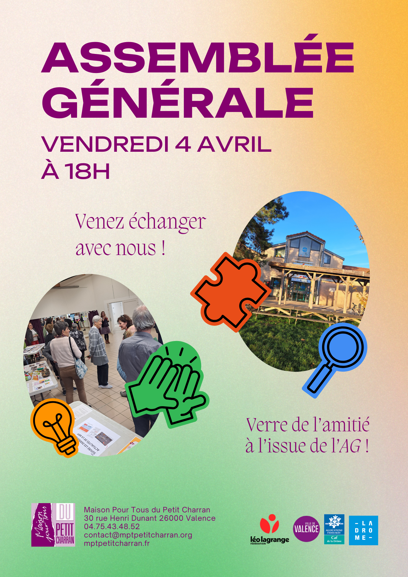 C’est un moment clé pour découvrir les bilans, les actions menées et les projets à venir. Mais c’est aussi une opportunité d’échange : votre voix compte pour faire évoluer cette Maison Pour Tous, un espace qui vous appartient.