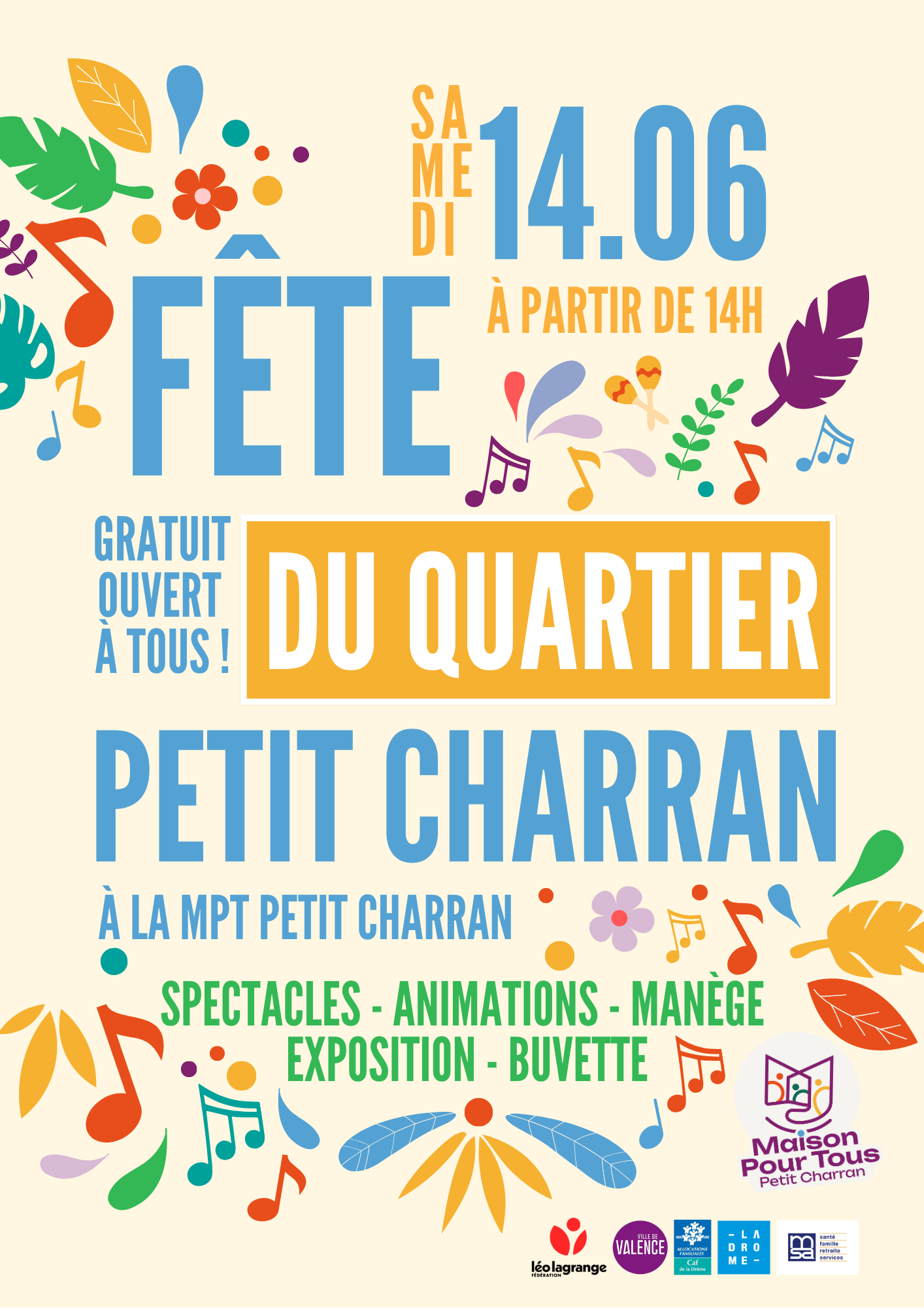 Ne manquez pas LA fête de l’année ! Une journée pleine de joie, de divertissements et de surprises vous attend dans le parc de la MPT du Petit Charran.