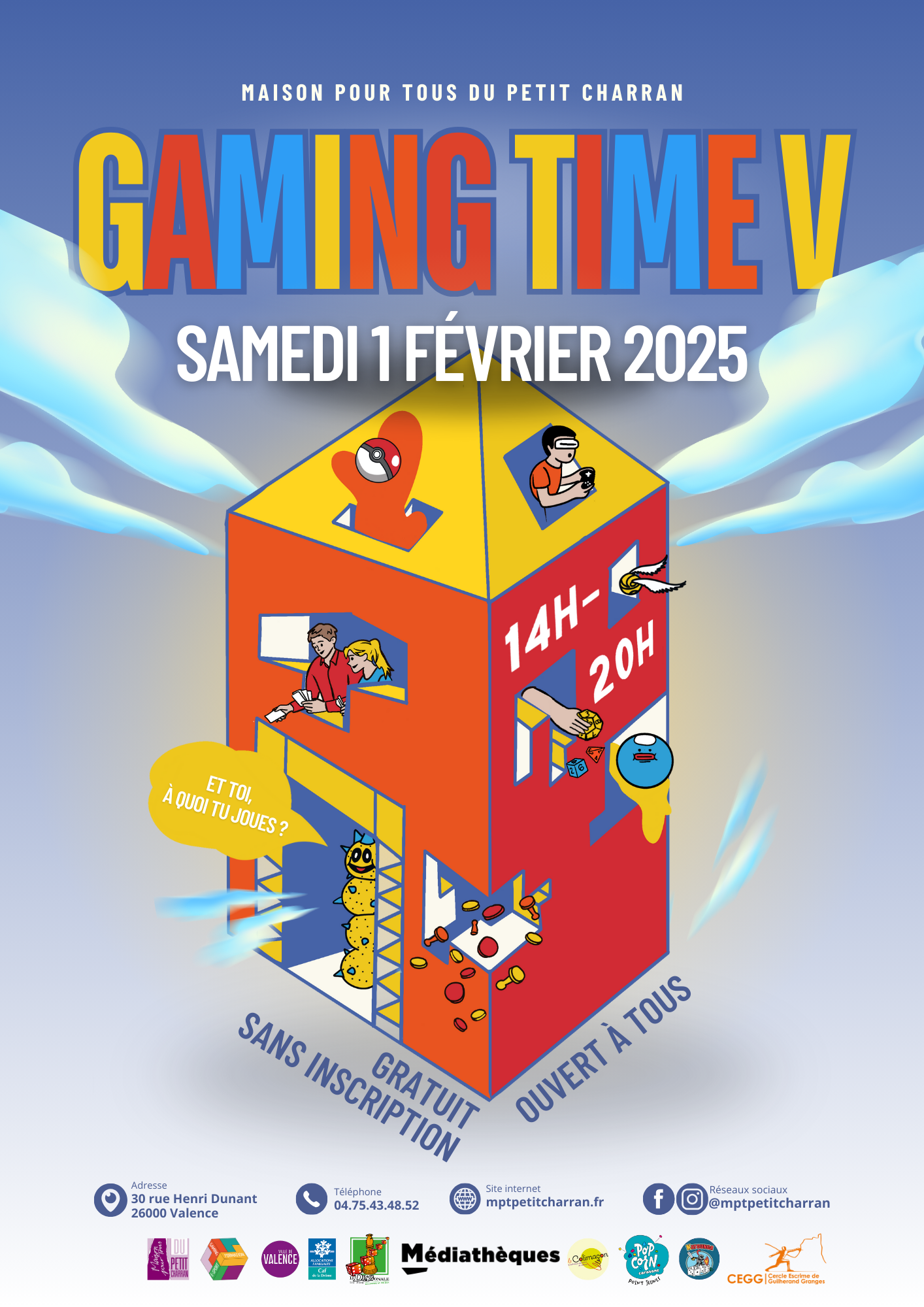 Venez vivre une expérience ludique inoubliable le 1er février 2025 de 14h à 20h à la MPT du Petit Charran pour la 5e édition de Gaming Time ! Cette journée gratuite et ouverte à tous propose un programme diversifié pour petits et grands :