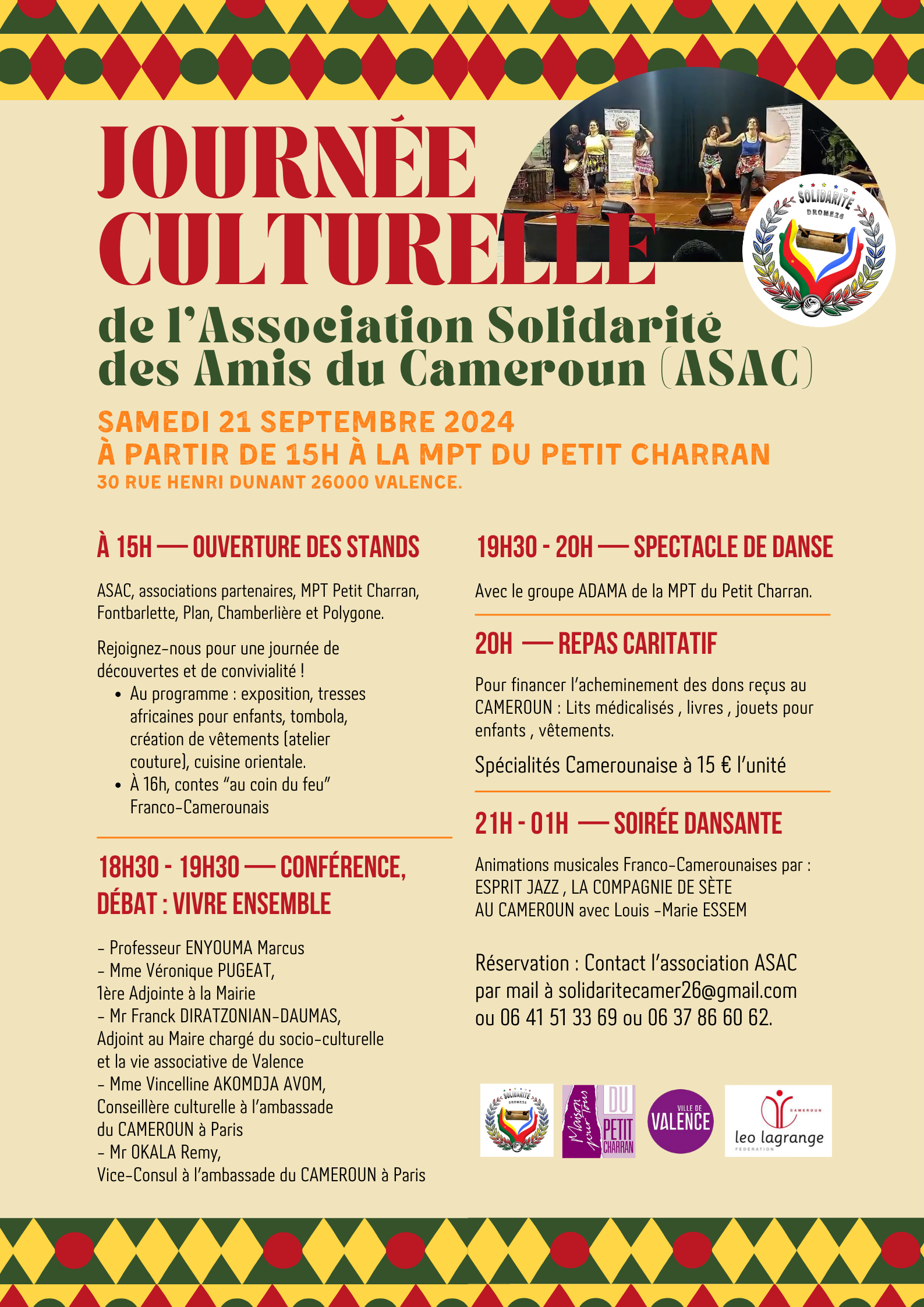 Le samedi 21 septembre 2024, dès 15h, rejoignez-nous pour célébrer la diversité culturelle avec l’Association Solidarité des Amis du Cameroun (ASAC) ! 🎉 Une journée pleine de découvertes, de partage et de convivialité vous attend !
