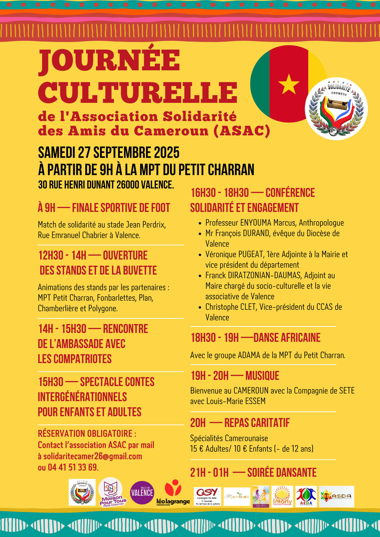 L’Association Solidarité des Amis du Cameroun (ASAC) vous invite à une journée culturelle exceptionnelle à la MPT Petit Charran, samedi 27 septembre à partir de 12h30.