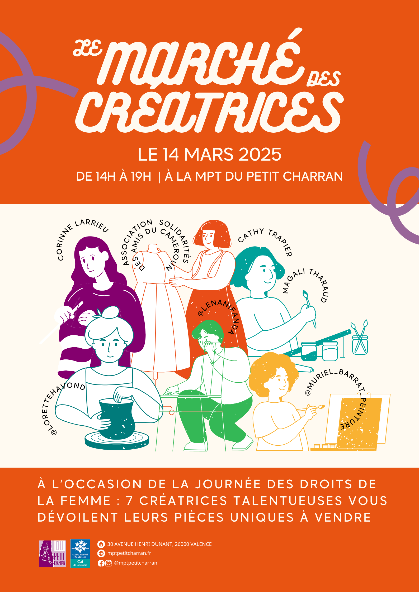 Le Marché des Créatrices s’installe à la MPT du Petit Charran le 14 mars 2025, de 14h à 19h Cet événement, organisé dans le cadre de la Journée des droits de la femme, met en lumière le talent de sept artisanes et créatrices locales : Corinne Larrieu, L’Association Solidarités des Amis du Cameroun, Lena Nifanda, Lorette Havond, Cathy Trapier, Magali Tharaud et Muriel Barrat.