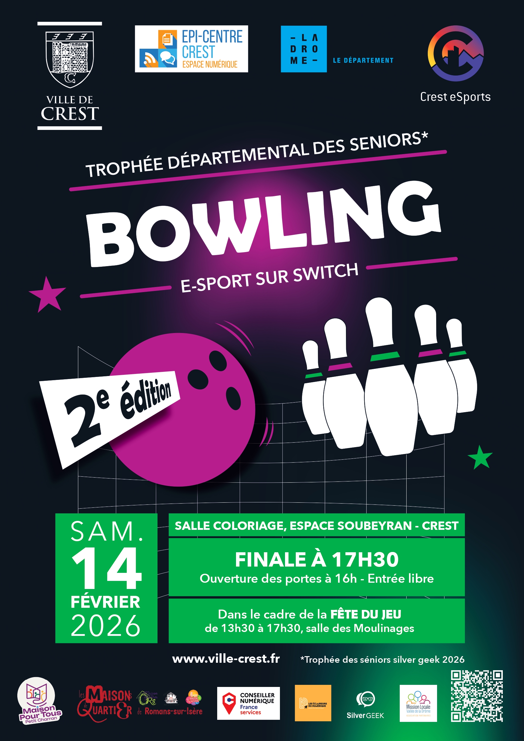 La finale de bowling e-sport sur Nintendo Switch se déroulera le samedi 14 février 2026 à Crest, dans un cadre convivial et festif, à l’occasion de la Fête du Jeu.