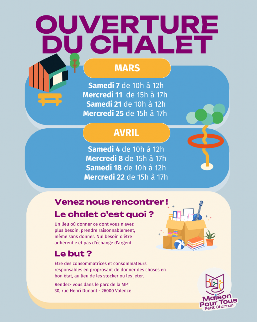 La Maison Pour Tous du Petit Charran ouvre son chalet solidaire en janvier. Déposez les objets que vous n’utilisez plus et repartez avec ce dont vous avez besoin. Un espace de partage, de solidarité et de réemploi ouvert à tous.