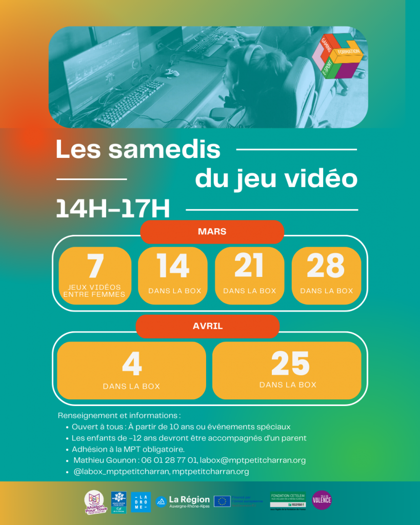 Chaque samedi, la Maison Pour Tous du Petit Charran vous propose des temps de jeu vidéo conviviaux dans La Box, sa salle gaming dédiée. Ouverts aux adhérents dès 12 ans (10 ans accompagnés), ces rendez-vous sont l’occasion de découvrir, tester et partager autour du jeu vidéo.